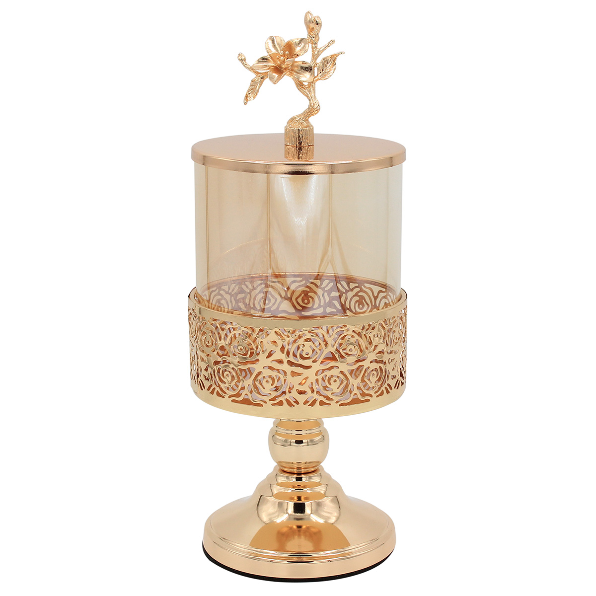Αυτή η φοντανιέρα είναι κατασκευασμένη από μέταλλο σε χρυσό χρώμα. Συνοδεύεται από γυάλινο κάλυμμα, προσδίδοντας μια αίσθηση πολυτέλειας και κομψότητας. Ιδανική για αποθήκευση και παρουσίαση γλυκών, μπορεί να χρησιμοποιηθεί τόσο για καθημερινή χρήση όσο και για ειδικές περιστάσεις. Μπορεί επίσης να χρησιμοποιηθεί ως διακοσμητικό στοιχείο στο σπίτι, δημιουργώντας μια ζεστή και φιλόξενη ατμόσφαιρα.
