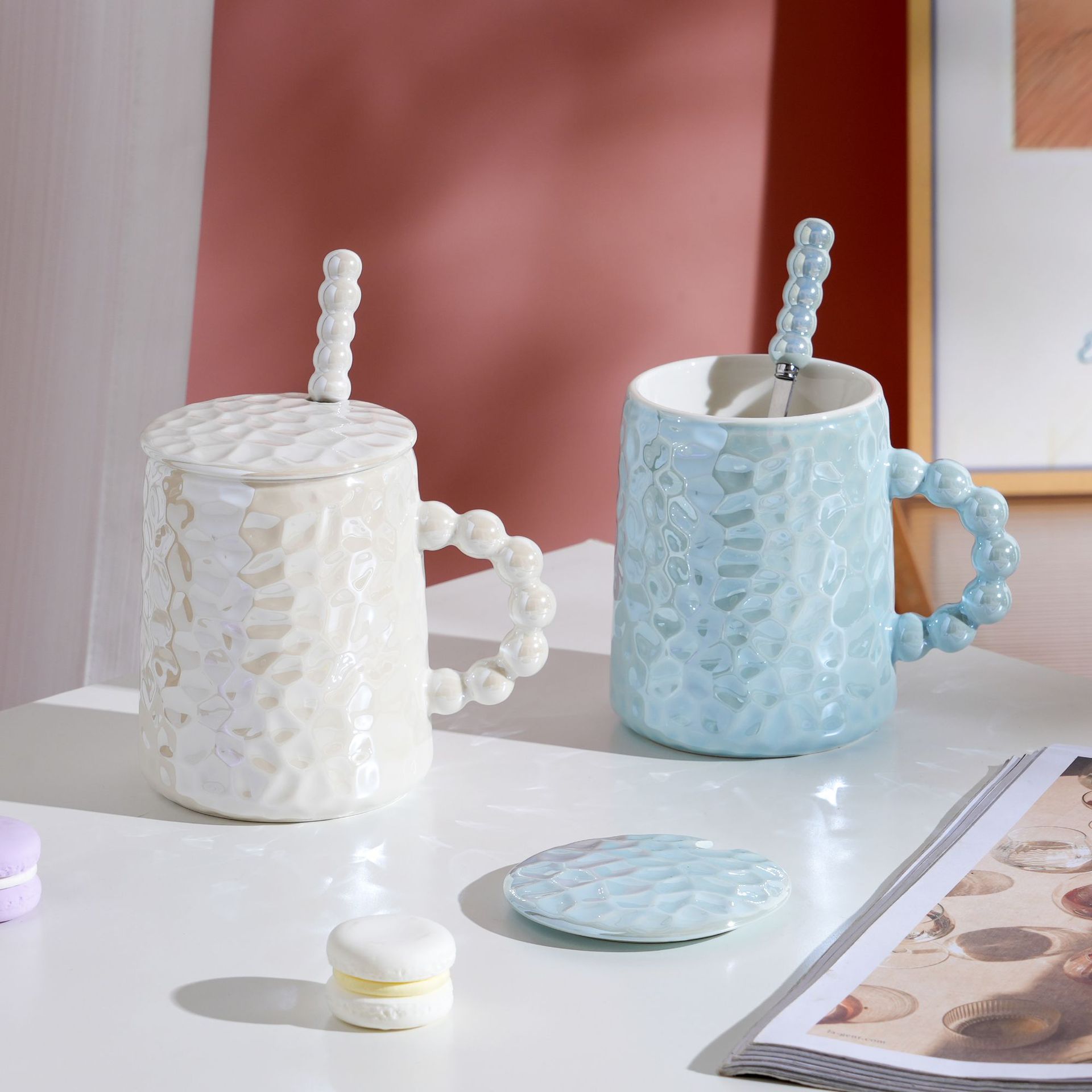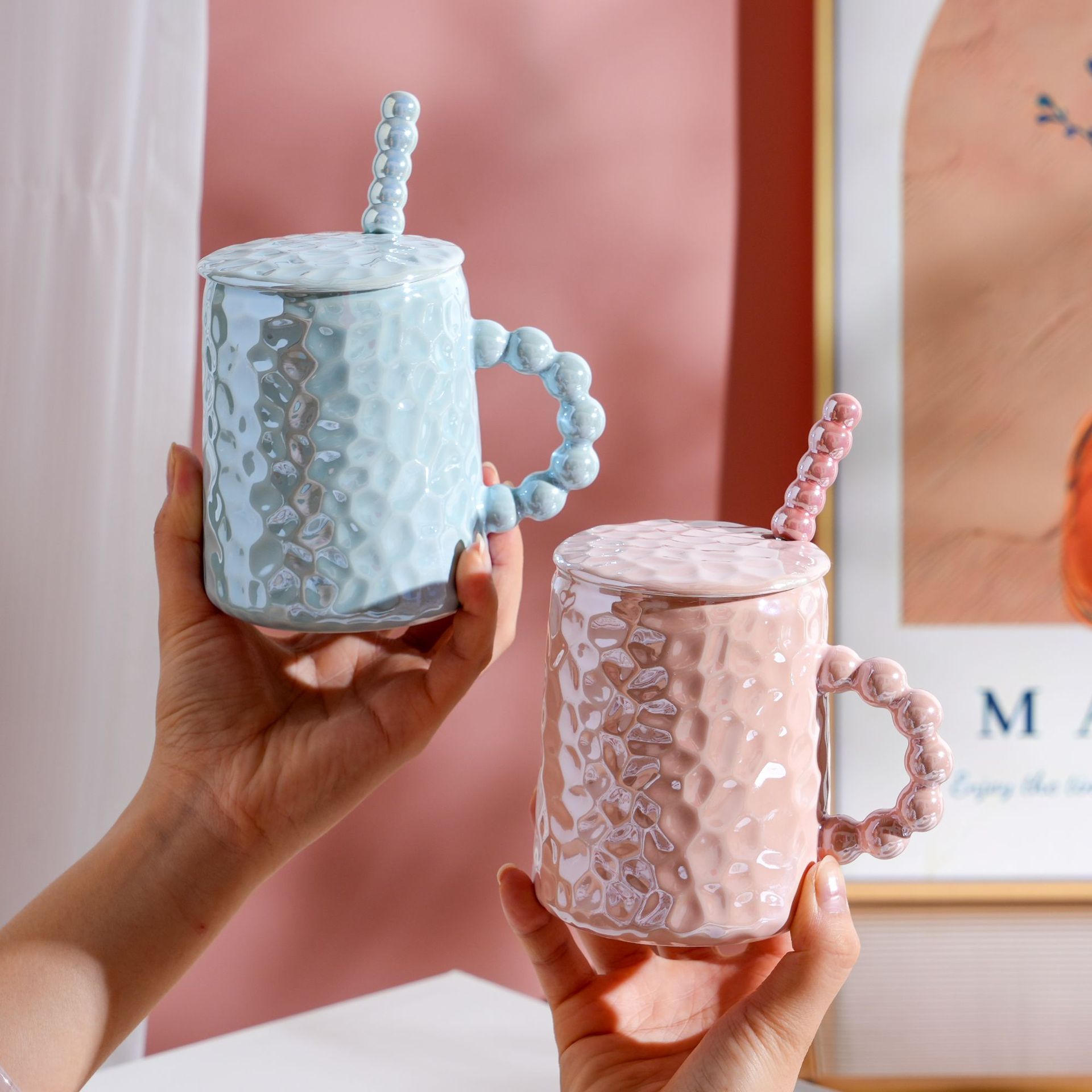 Κούπα κεραμική διακοσμ. 450 ml 13Χ9Χ11 εκ. Σιέλ πέρλα με καπάκι και κουταλάκι