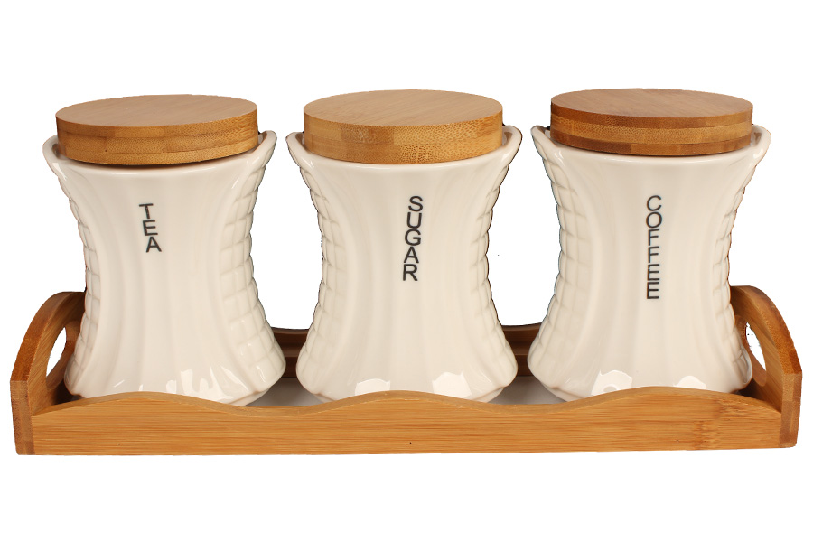 Βάζα αποθήκευσης πορσελάνη τεμ. 3 με ξύλινη βάση – KESKOR 67422